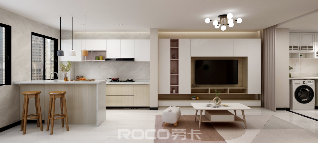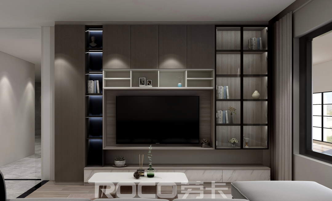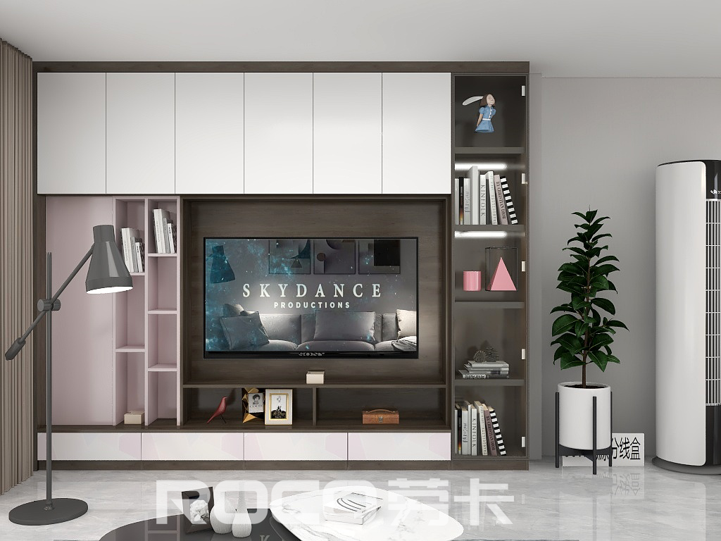 整墻電視柜設計,將整面墻利用起來(lái),增加儲物空間,封閉式柜子可以放置日常不太美觀(guān)的物品,而開(kāi)放式柜子則可以放置常用物品,拿取更方便。