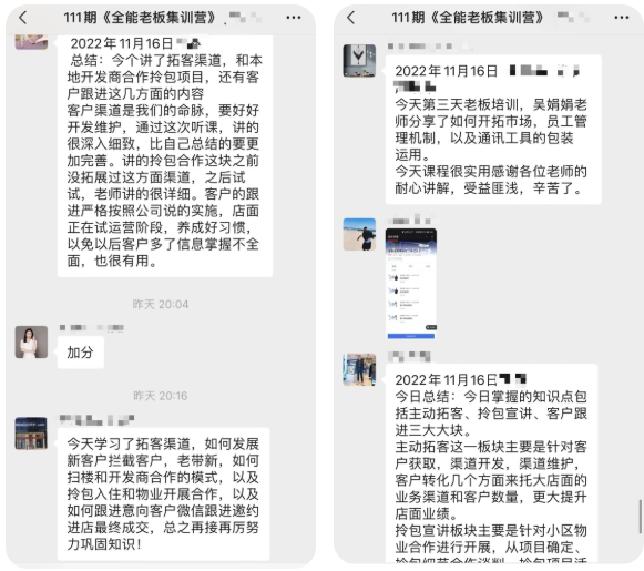 盡管這次是線(xiàn)上培訓,但是培訓課程的內容依然是十分全面!其中包含總經(jīng)理崗位職責、品牌戰略規劃、1+N運營(yíng)模式等管理板塊,除此之外還包括渠道開(kāi)發(fā),客戶(hù)維護,產(chǎn)品成交全過(guò)程的實(shí)戰演練板塊。同時(shí)培訓課程緊貼市場(chǎng)現狀進(jìn)行制定,隨時(shí)更新,充滿(mǎn)針對性,從多維度強化學(xué)員各項技能,促進(jìn)老板們的全面發(fā)展。