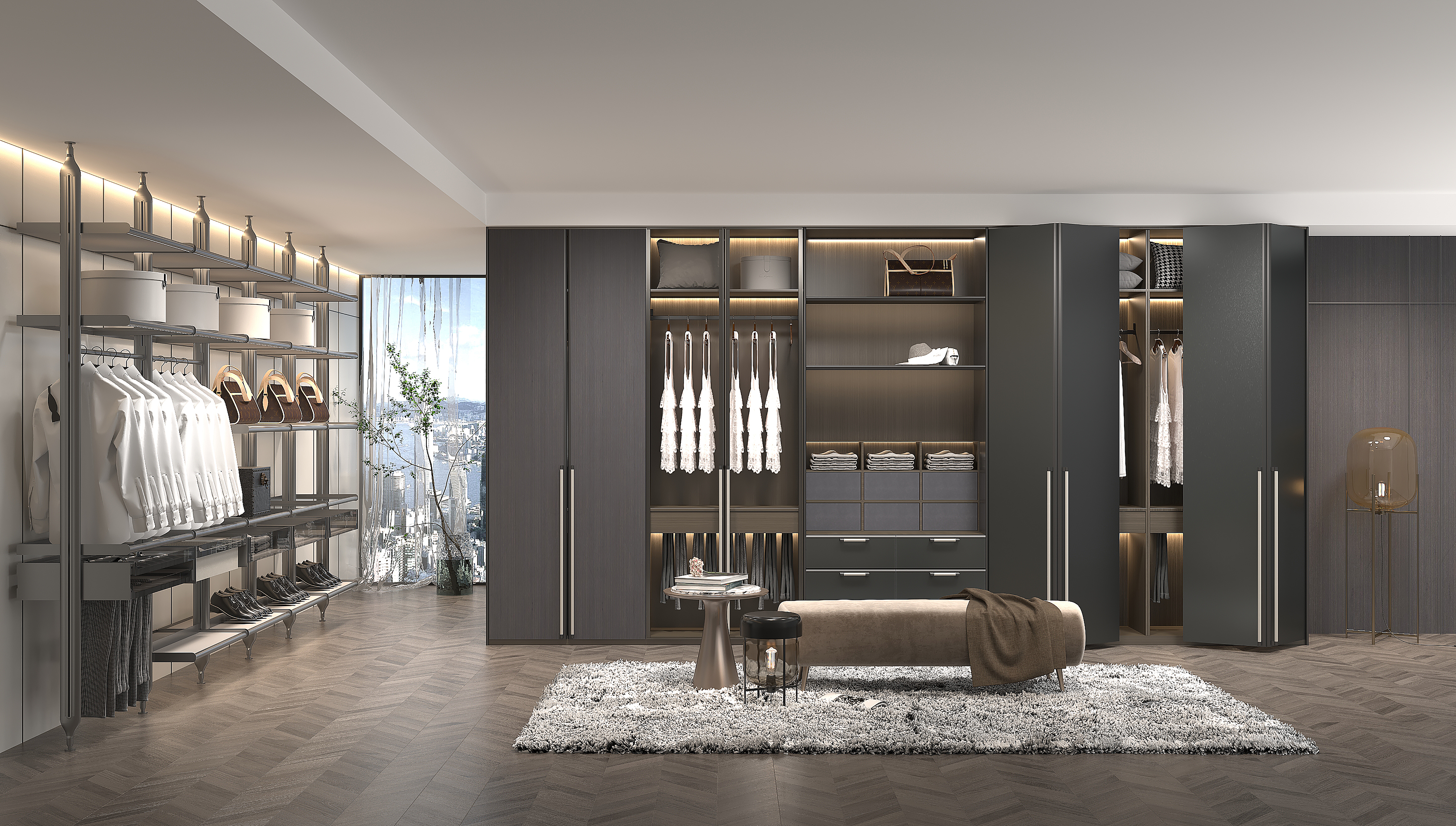 臥室衣帽間設計L型到頂式,高級的金屬和玻璃元素,不僅讓衣帽間通透顯大,還能完美體現居住者的時(shí)尚品味;其中創(chuàng )新應用折疊門(mén),密封性好,最大限度擴大內部可視空間,衣物拿取一覽無(wú)遺,衣帽間全開(kāi)放也不用擔心