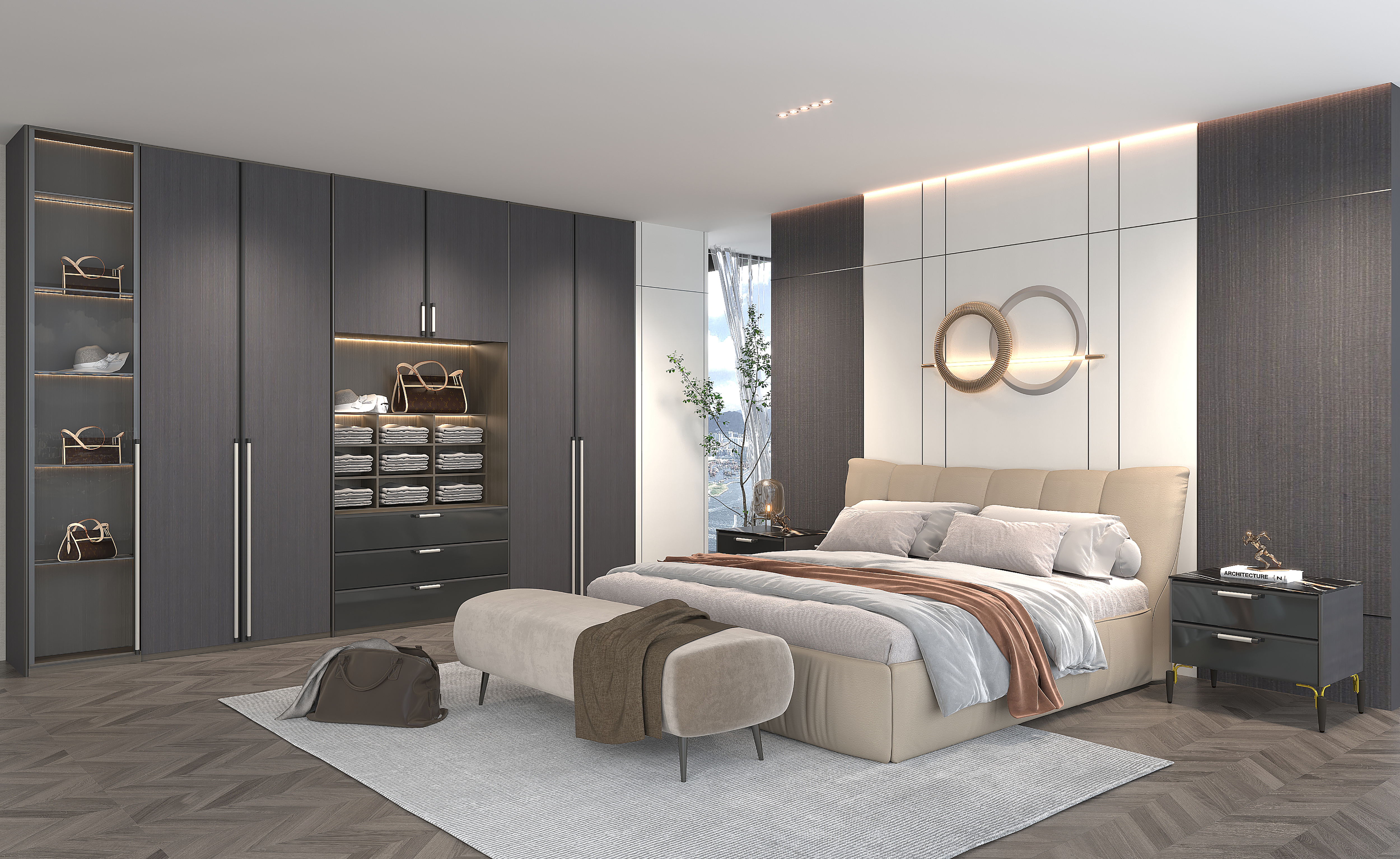 一體化新奢科技木皮護墻板結合現代無(wú)主燈設計,造就朦朧感和氛圍感,營(yíng)造深邃的高格調。 掩門(mén)黑色與優(yōu)雅木紋線(xiàn)條形成反差呈現干練特性,搭配意式輕奢真皮床,秩序與層次的美觀(guān)便在點(diǎn)滴間形成。