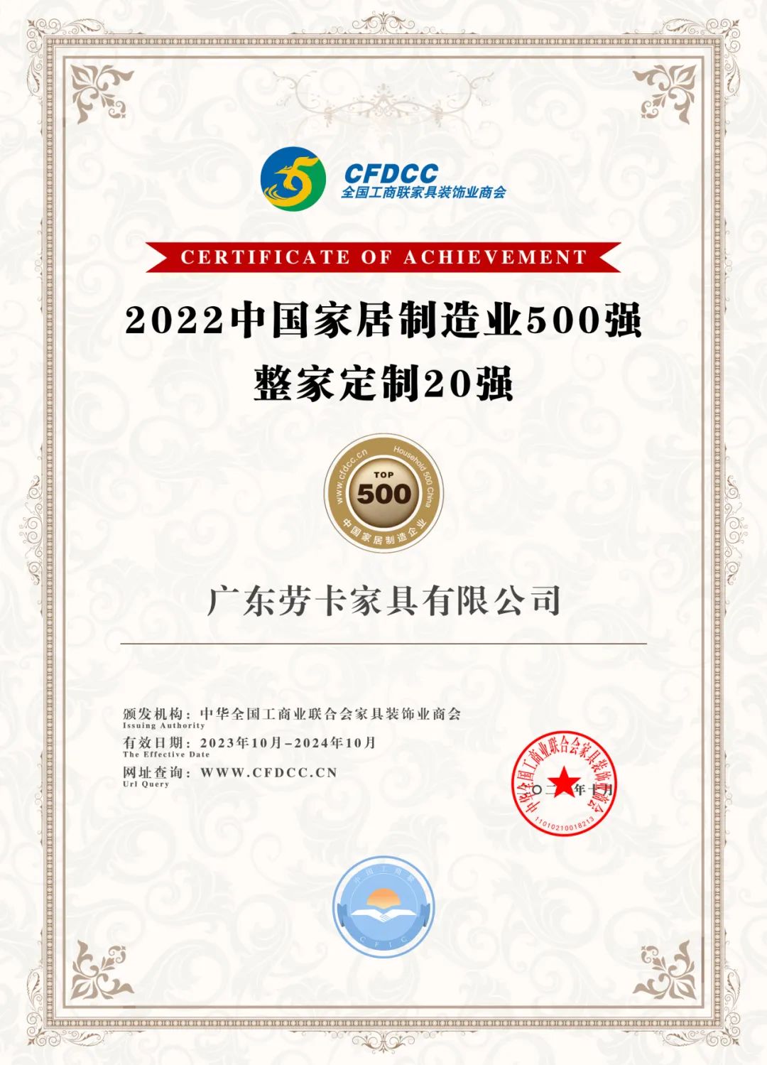 2023年10月15日~17日,由全國工商聯(lián)家具裝飾業(yè)商會(huì )主辦的“2023中國家居業(yè)高質(zhì)量發(fā)展大會(huì )”在贛州市南康區舉辦。在眾多家居企業(yè)中,勞卡家居憑借卓越的產(chǎn)品質(zhì)量和強大的品牌影響力榮獲了"2022中國家居制造業(yè)500強-整家定制20強"的殊榮。