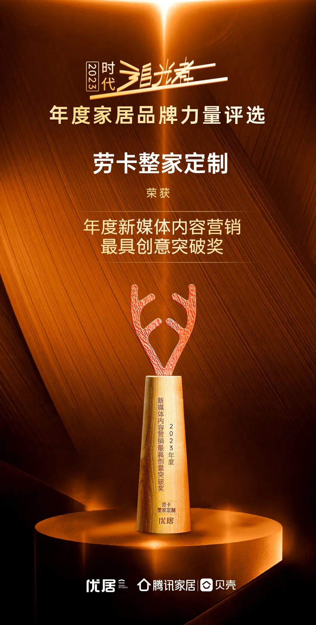 在此次峰會(huì )上,“時(shí)代追光者”2023年度中國家居品牌力量評選結果同步揭曉。勞卡憑借在新媒體內容營(yíng)銷(xiāo)領(lǐng)域中打破傳統思維,推陳出新,對行業(yè)產(chǎn)生積極的影響和啟示,斬獲“年度新媒體內容營(yíng)銷(xiāo)最具創(chuàng )意突破獎”。