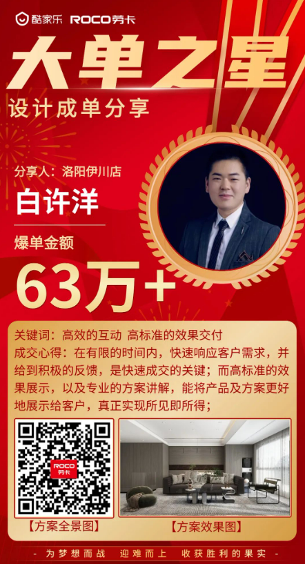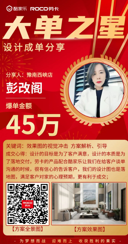 來(lái)自豫南西峽店的設計師彭改閣分享其45萬(wàn)元訂單時(shí),強調給客戶(hù)做方案的時(shí)候,更多的是考慮方案的可落地性。因此,方案的整體成效、產(chǎn)品的細節表現尤為重要。“面對重要客戶(hù)的時(shí)候,都會(huì )使用8K、16K、32K等高清渲染效果圖,將材質(zhì)細節表現得更加細膩。”