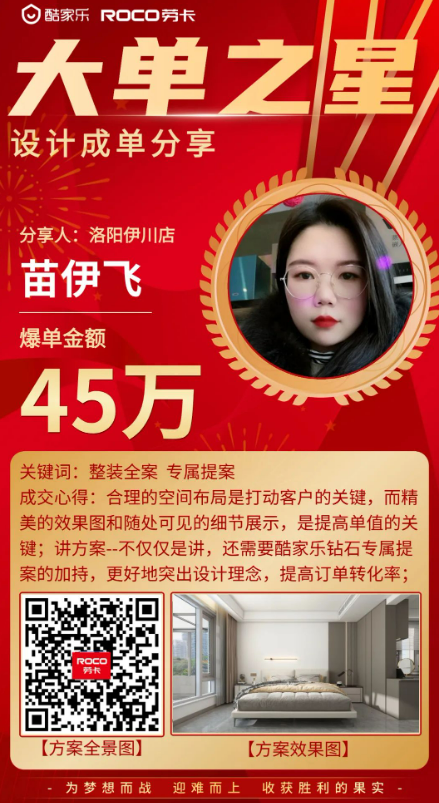 學(xué)員洛陽(yáng)伊川縣設計師苗伊飛,8月份的時(shí)候也成功拿下了一張45萬(wàn)元的訂單。她分享道:每次給重點(diǎn)客戶(hù)提案的時(shí)候,都會(huì )做足準備,那就是為每一位客戶(hù)準備專(zhuān)屬的PPT提案。這樣一來(lái),不僅能更好地幫助自己將方案表達清楚,同時(shí)也讓客戶(hù)感受到被重視,留下良好的印象,打下扎實(shí)的信任基礎,大大促進(jìn)后續成交。