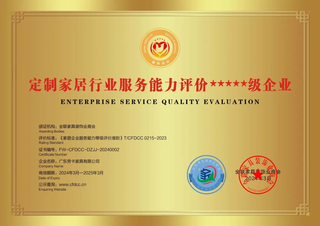 近期,全聯(lián)家具裝飾業(yè)商會(huì )發(fā)布《關(guān)于2023年度第一批家居業(yè)企業(yè)信用評價(jià)、質(zhì)量評價(jià)、服務(wù)評價(jià)結果的公告》,公告對家居行業(yè)最具影響力的家居裝飾、建材企業(yè)等進(jìn)行復合評價(jià)。其中,廣東勞卡家具有限公司榮獲“定制家居行業(yè)產(chǎn)品質(zhì)量評價(jià)★★★★★級企業(yè)”“定制家居行業(yè)服務(wù)能力評價(jià)★★★★★級企業(yè)”,以及“定制家居行業(yè)信用評價(jià)AAAAA級企業(yè)”三項榮譽(yù)。
