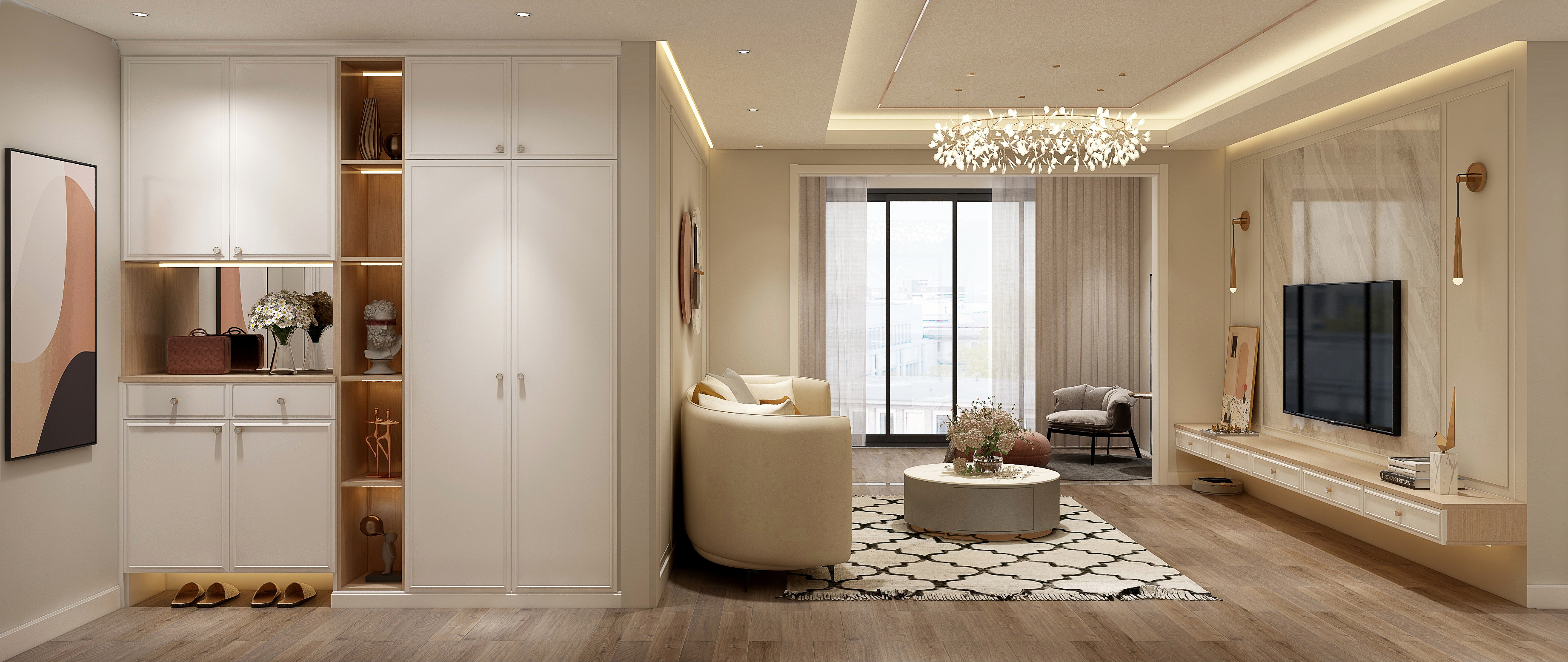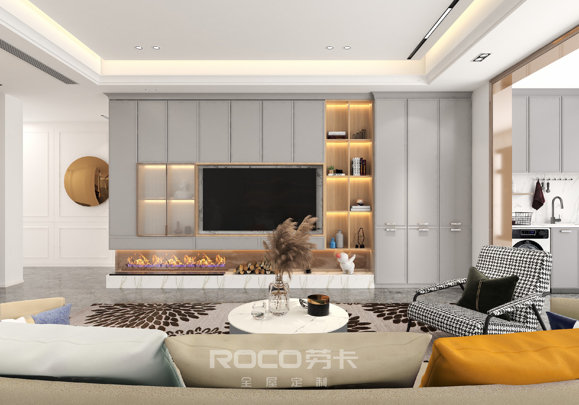 一柜到底的恢弘感,不同材質(zhì)之間的搭配與對比,空間豐盈而優(yōu)美。嵌邊金屬線(xiàn)框門(mén)板帶來(lái)空間輕奢質(zhì)感,嵌入式燈帶設計,見(jiàn)光不見(jiàn)燈,增加空間格調。