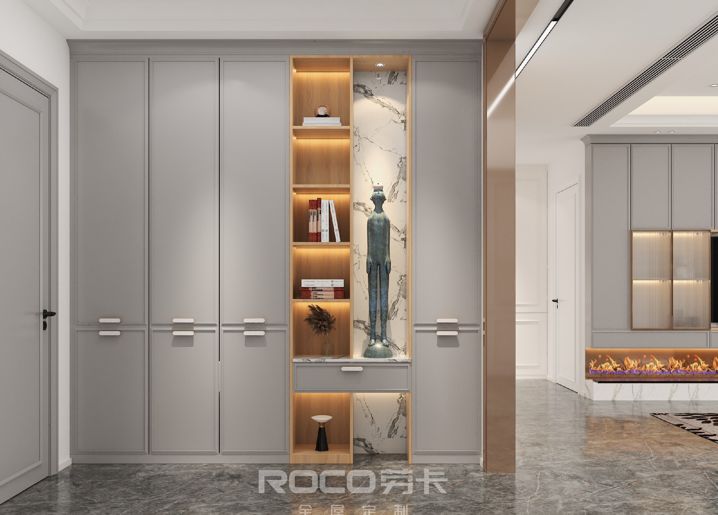 優(yōu)雅高貴的配色,向客人展現了高尚的品味。一柜到頂的入墻式入戶(hù)柜,美觀(guān)實(shí)用,還不會(huì )浪費地方,開(kāi)放+半封閉的設計,讓展示和收納區融為一體,整個(gè)門(mén)廳顏值直線(xiàn)上升。