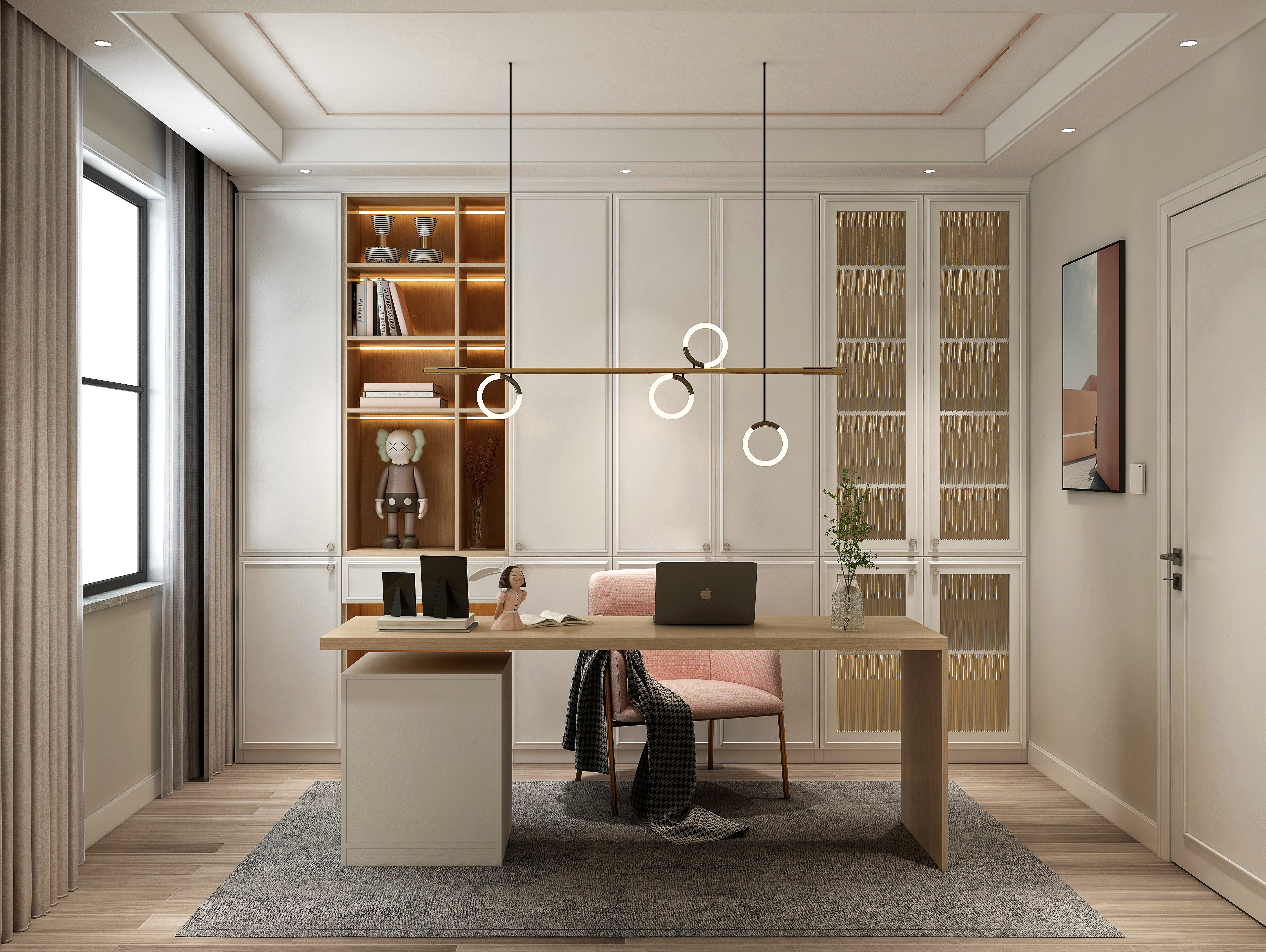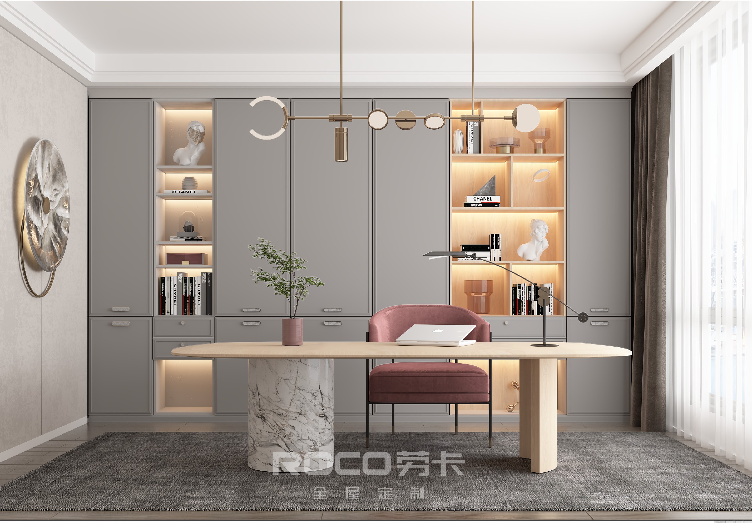 富有層次感柜身面板凹紋,如畫(huà)龍點(diǎn)睛般展現空間的精致。大理石的運用讓沉悶的書(shū)房點(diǎn)綴了大自然氣息與空間的流動(dòng)感,配合著(zhù)落地大玻璃窗,提高了書(shū)房的光亮度與舒適感。