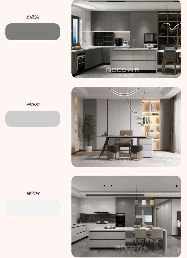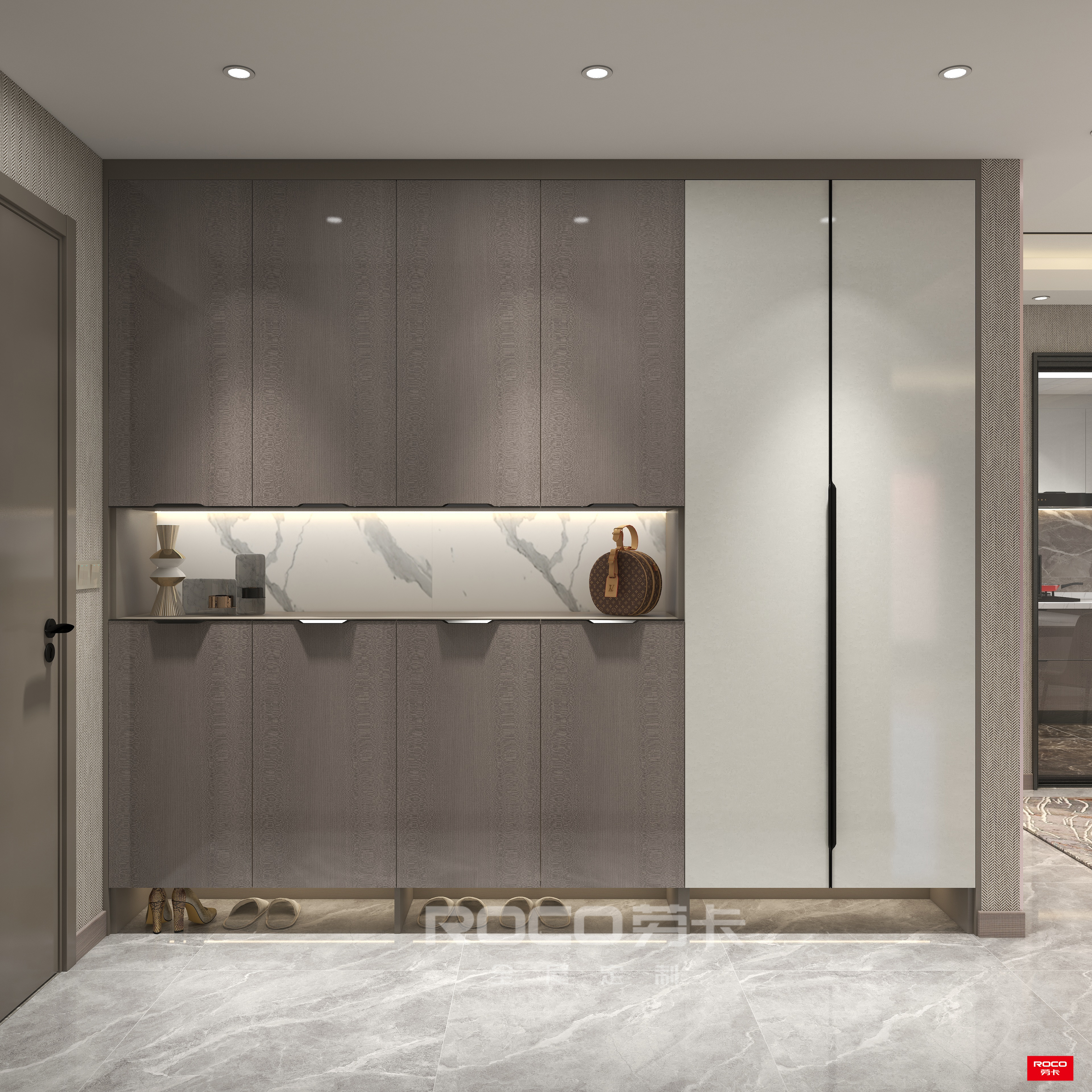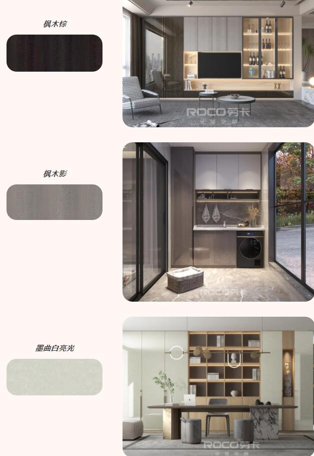 勞卡全屋定制本次新推出的極簡(jiǎn)主義V4系列輕奢版的三款UV亮光門(mén)板花色,是勞卡自主開(kāi)發(fā)的專(zhuān)屬花色,表面帶有獨特的花紋——楓木表面疏密有致的木紋紋理,打造家居的自然之感;墨曲白虛虛實(shí)實(shí)的山水紋,延綿流長(cháng),營(yíng)造出一副山水意境,造就雅致的詩(shī)意生活。UV亮光門(mén)板的三款新花色打破了純色亮光門(mén)板的單調枯燥,為家裝設計提供了更多可能性,讓搭配更獨特、更具層次、更富有美感。