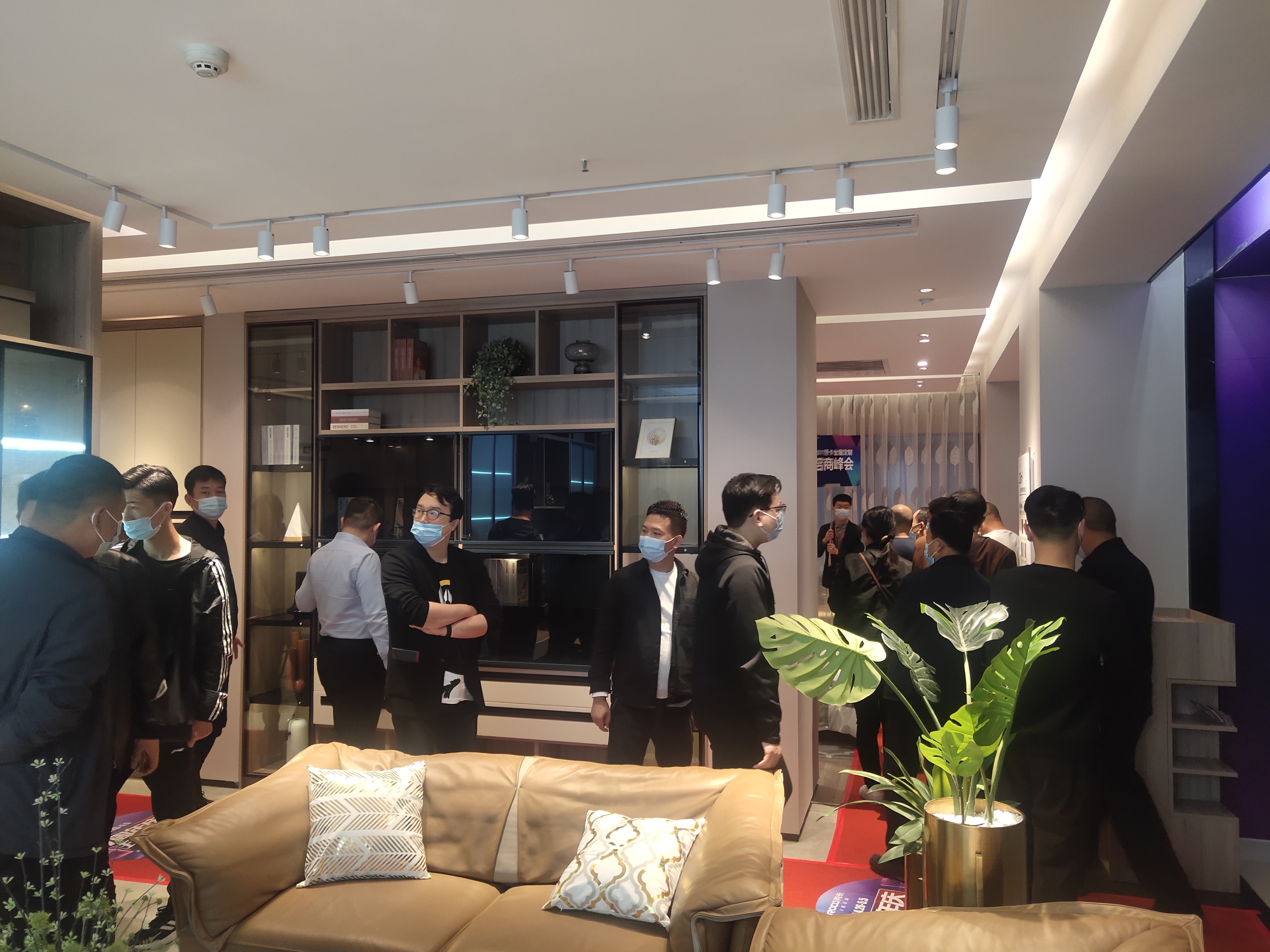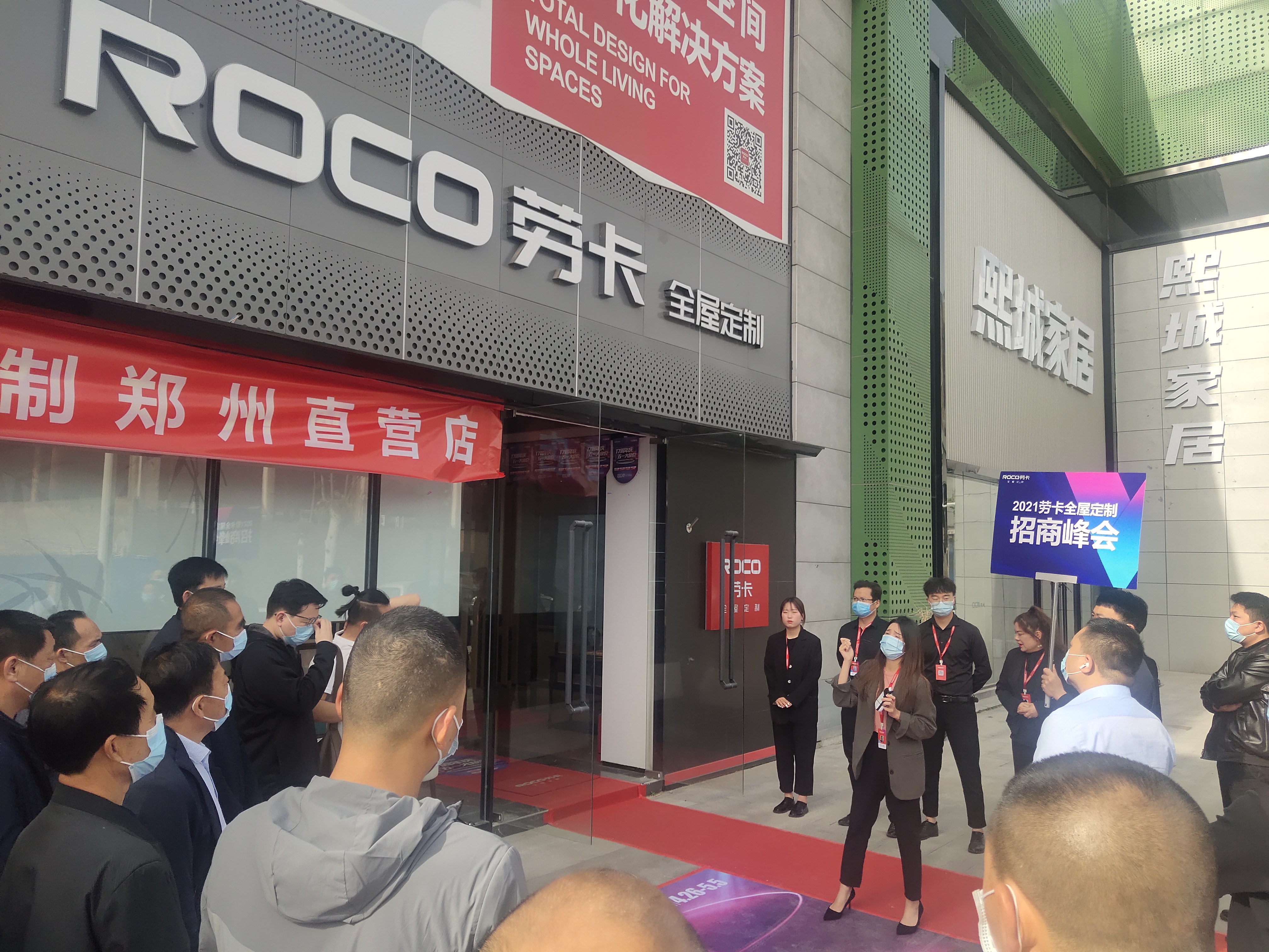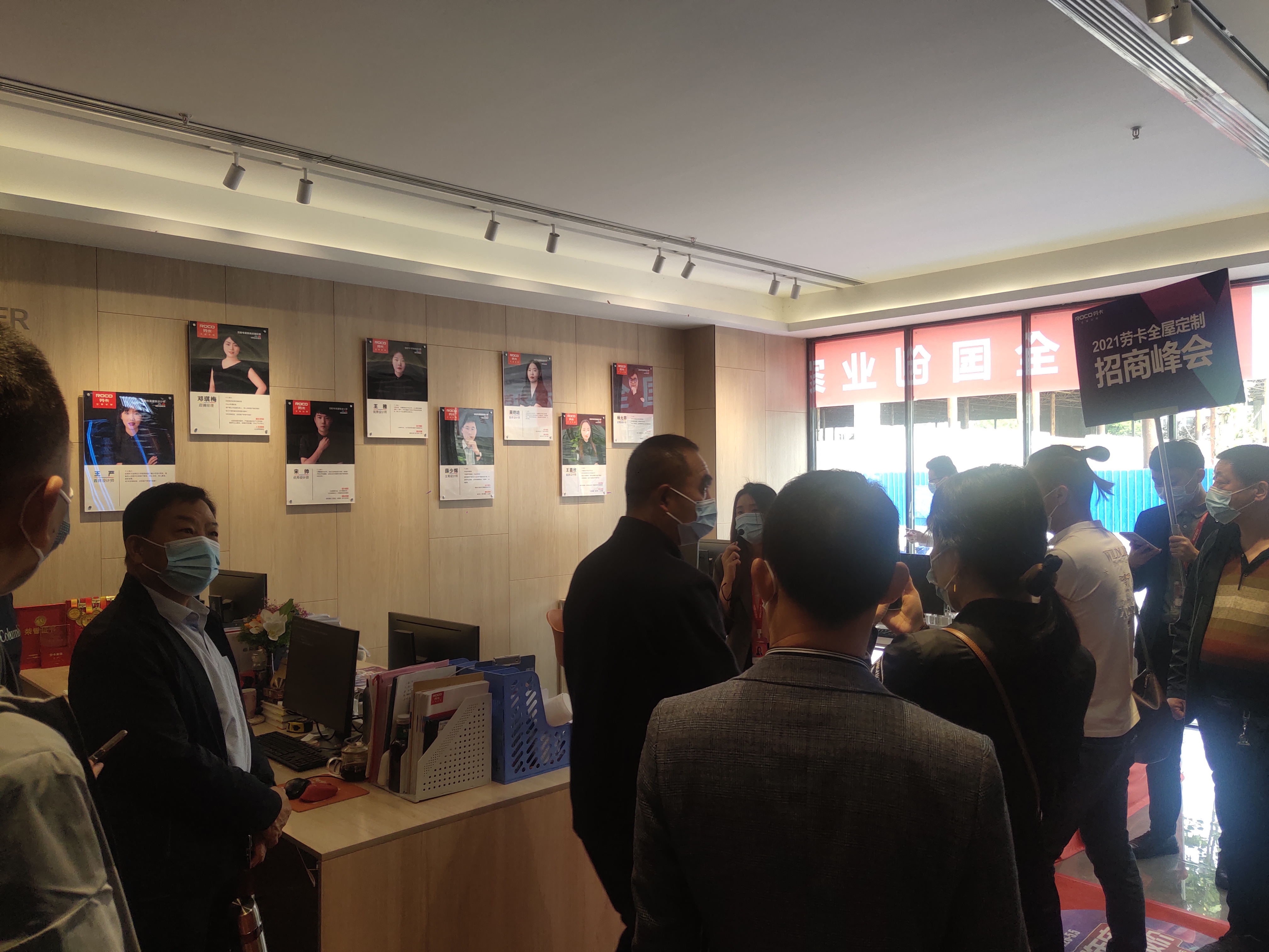 會(huì )議之前,勞卡組織了各位意向加盟商前往鄭州直營(yíng)500平展廳參觀(guān)。高端大氣的門(mén)頭彰顯著(zhù)時(shí)尚潮流的定位,年輕化的形象給人第一眼的親切感。步入勞卡新生活方式展廳,嘉賓們近距離體驗定制空間設計的魅力。十大空間一站式解決方案,為消費者提供便捷的購物體驗,也為終端銷(xiāo)售擴單助力。