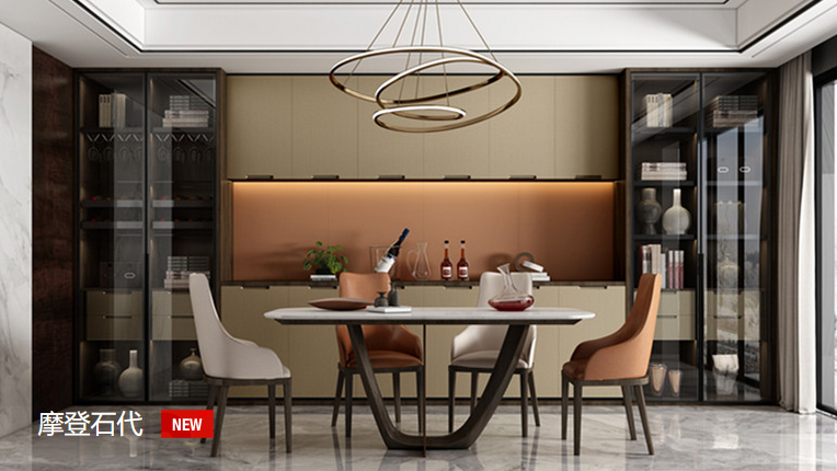 大膽的材料碰撞,鑄就了個(gè)性非凡的摩登主義。巖板、金屬、玻璃……當代質(zhì)感的領(lǐng)航者相匯一處,新潮與精致便不言而喻。錯落有致的藏酒格,集剔透感與漂浮感于一體的玻璃元素,加以隱藏式燈帶,彰顯出華麗的空間視覺(jué),紋理豐富的巖板加持,讓柜體在沉調與亮調中自由探索,摩登奢華之感留步于此。