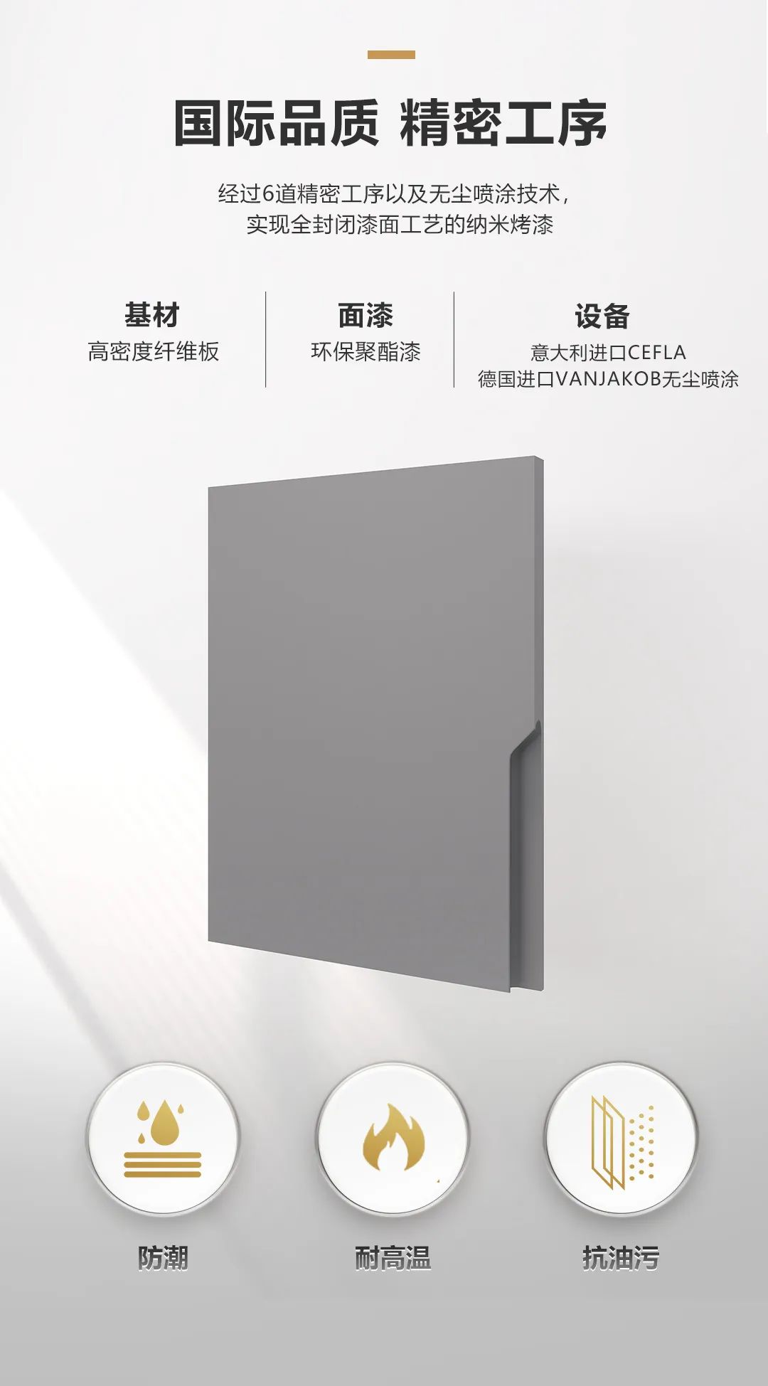 納米烤漆板表面采用了烤漆工藝,不僅能夠有效防水、防潮,無(wú)需封邊,而且可以滿(mǎn)足多種復雜門(mén)板造型需求,提升整體空間質(zhì)感。
