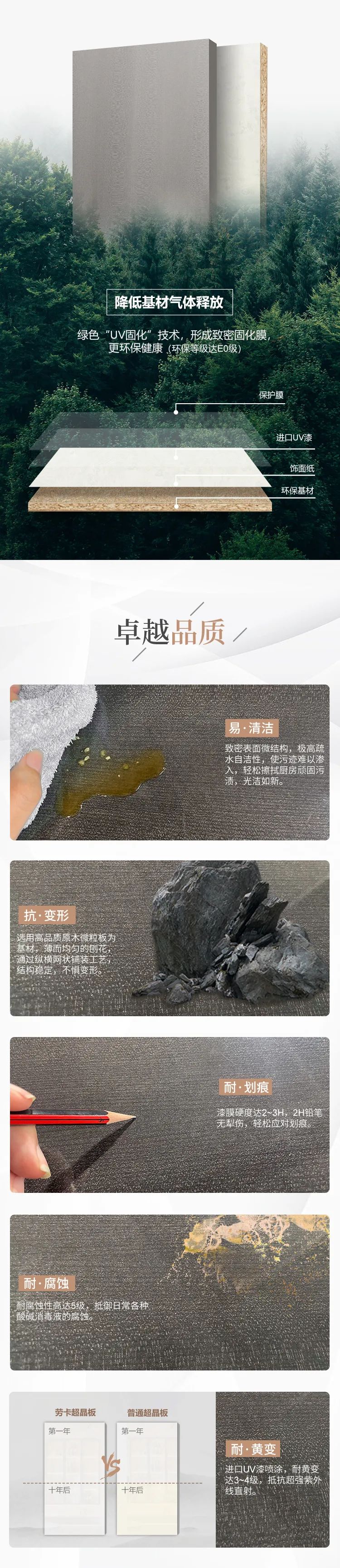 超晶板是將基材進(jìn)行表面處理后,再淋涂UV漆,具有耐高溫、耐磨、耐老化等優(yōu)勢,更好清潔打理,減輕廚房家務(wù)負擔。同時(shí),由于其表面的UV漆不含有機溶劑,更加環(huán)保安全。