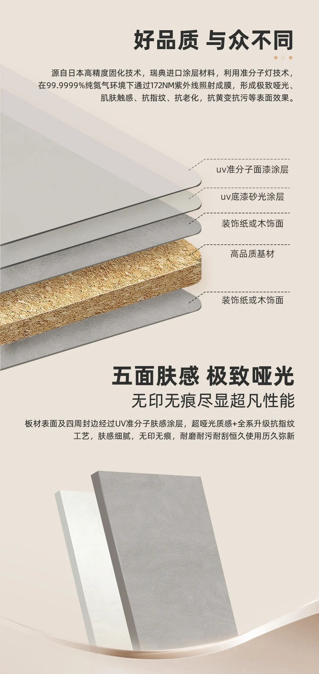 新一代UV準分子親膚板是勞卡門(mén)板系列中性能最佳的,足足有8大性能,完美解決平時(shí)大家會(huì )遇到的柜門(mén)痛點(diǎn)!