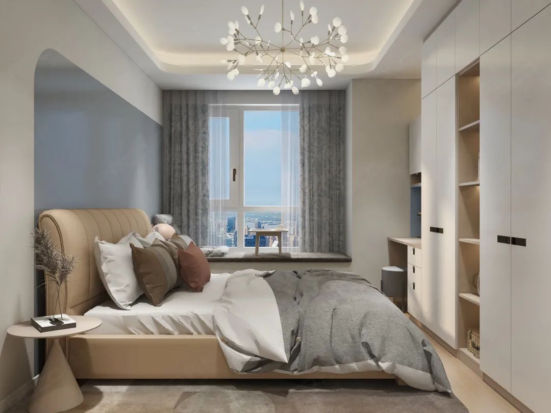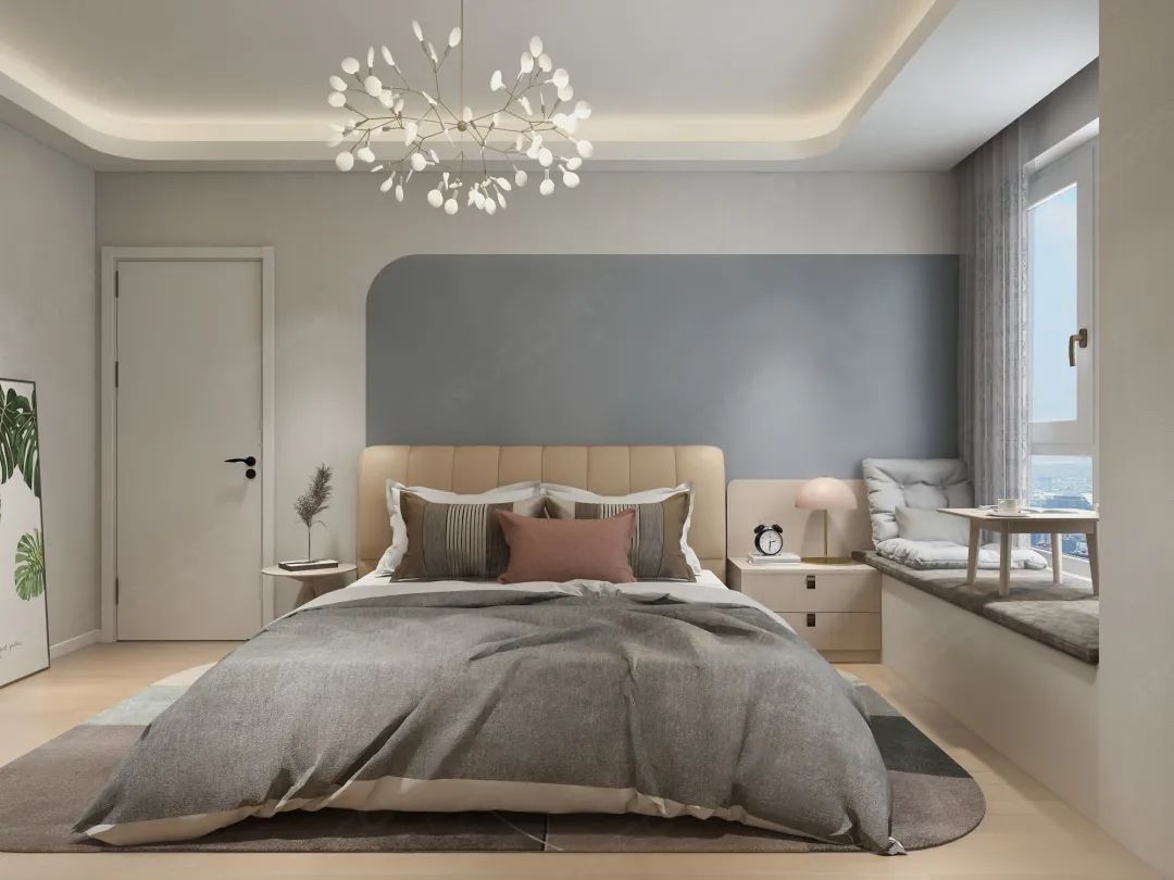 在溫柔潔凈的白色系的基礎下,床頭背景墻加入藍色色彩點(diǎn)綴,極大提高視覺(jué)沖擊力,讓房間自帶舒適性同時(shí)不失時(shí)尚性。