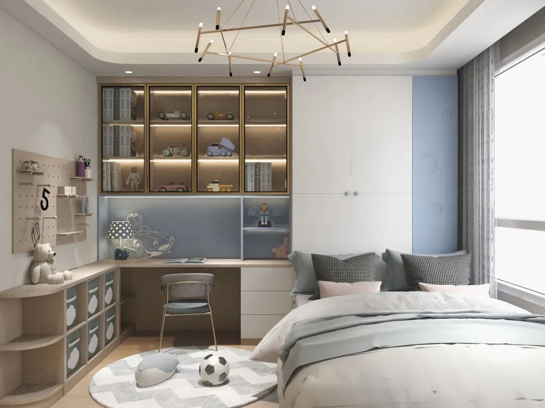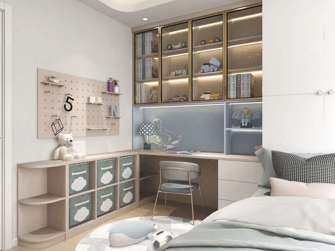 大量的展示空間設計,孩子還幼小的時(shí)候:擺放玩具,從小培養收納的好習慣;孩子長(cháng)大后:擺上榮譽(yù)的獎杯或者得意的作品,增強自信心。