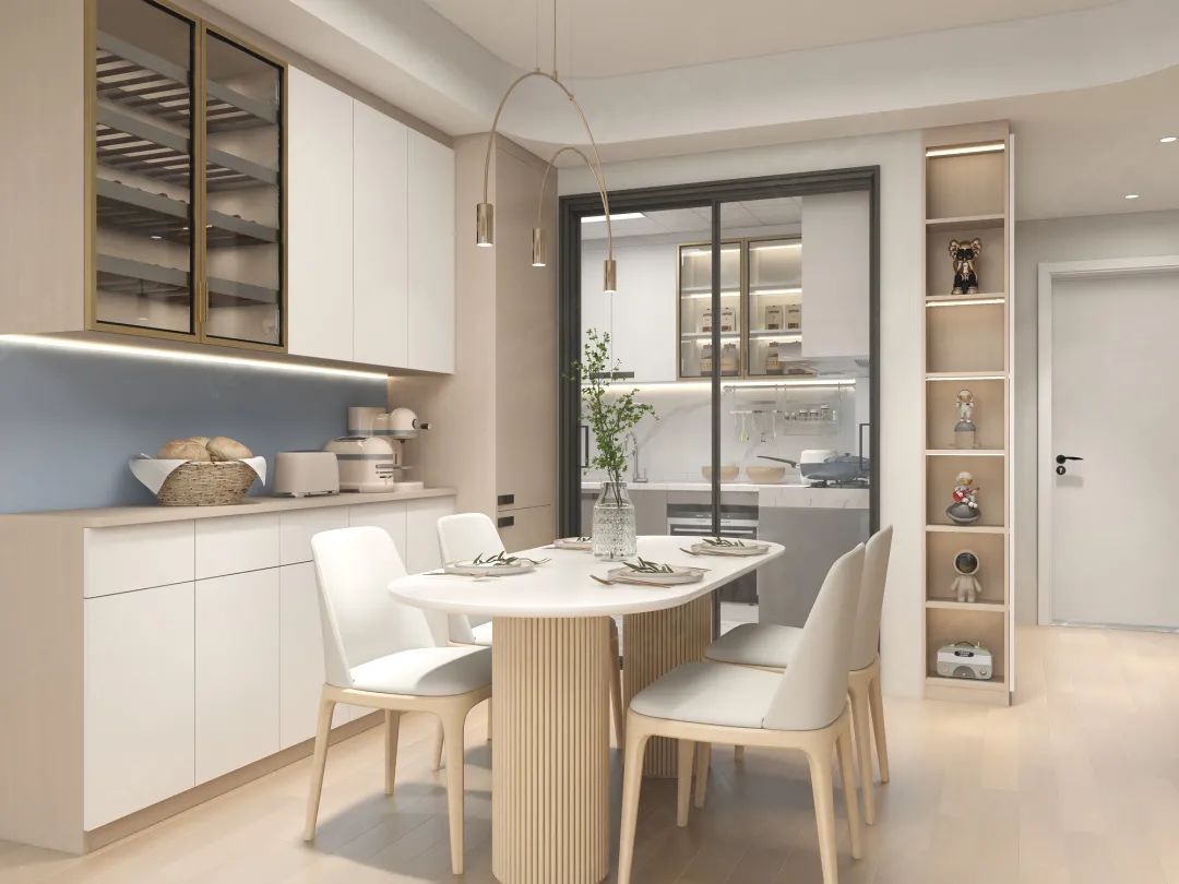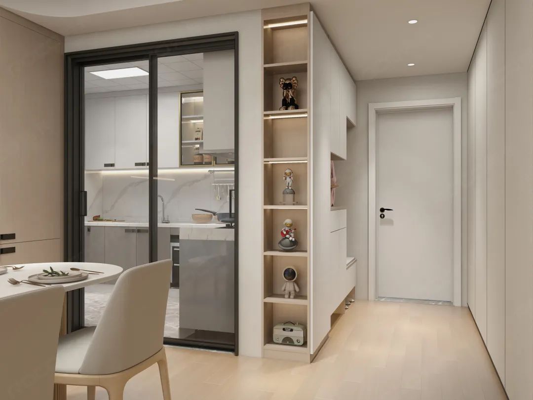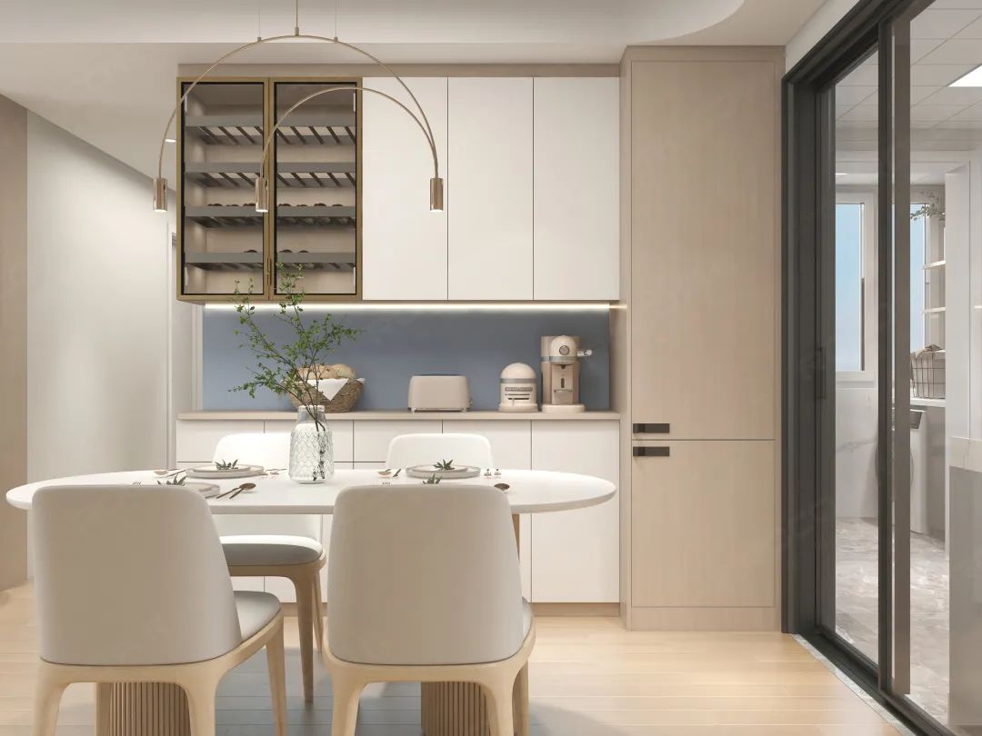 餐廳這邊設計通頂的餐邊柜,中部留空+玻璃掩門(mén)的搭配設計,不僅有拉伸空間的效果,還能提升設計感。