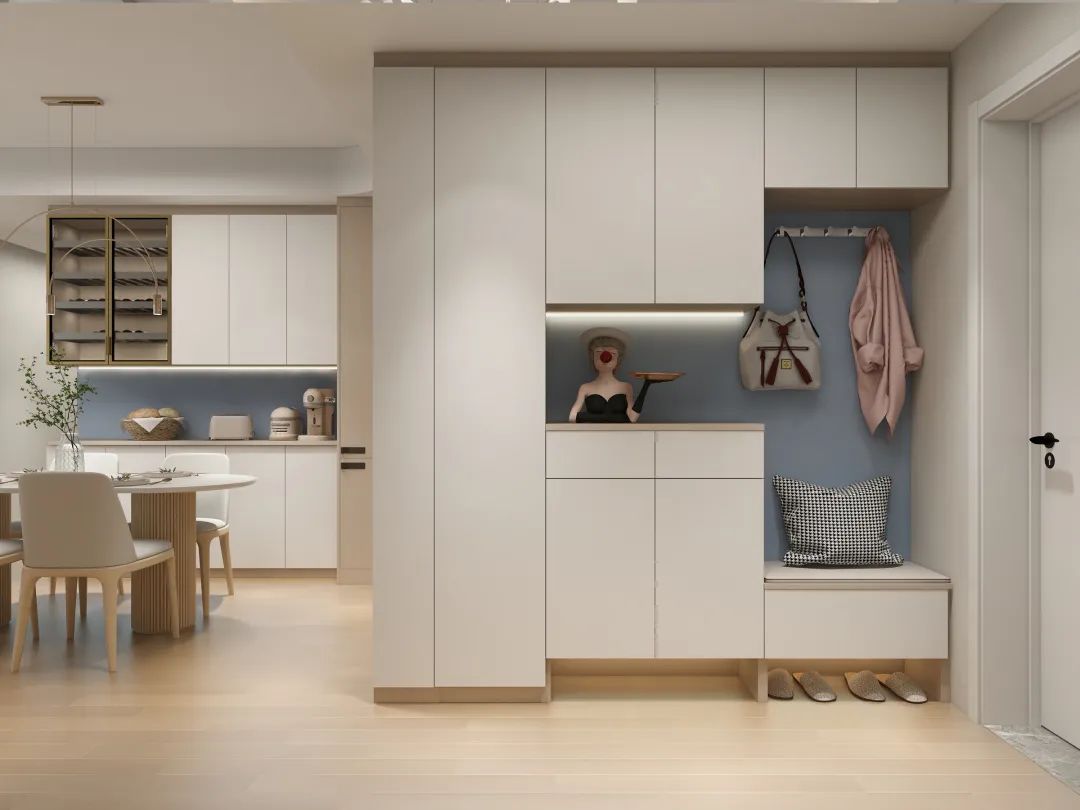 封閉式柜體收納不常穿的換季鞋子,中部留空于放置包包、鑰匙等小物品,繼續往下設計換鞋凳,還搭配安裝掛衣鉤。玄關(guān)柜錯落的設計,靈動(dòng)簡(jiǎn)約實(shí)用。