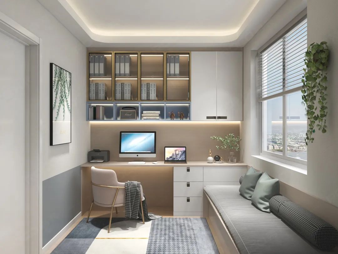 書(shū)桌上方的半開(kāi)放式吊柜滿(mǎn)足收納與展示作用,平時(shí)@嘉樂(lè )工作累了,就近躺在坐榻上休息,眺望正在晾衣服的妻子,設計十分貼心。