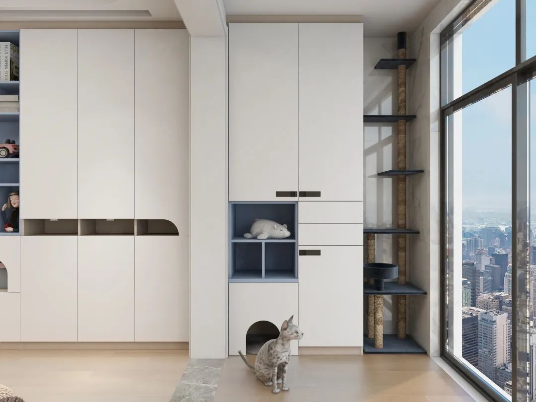 打通陽(yáng)臺設計柜體并把這里打造成萌寵的生活區域,既減輕了客廳收納壓力,又營(yíng)造清爽整潔的氛圍。