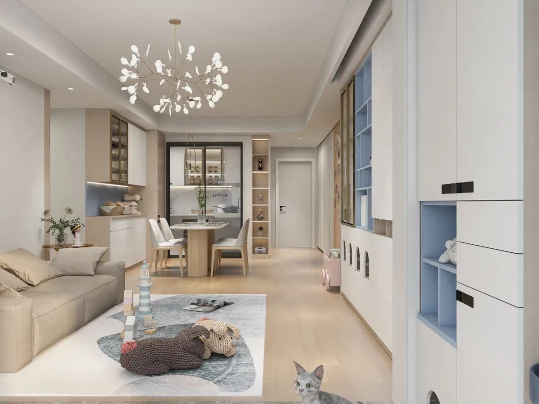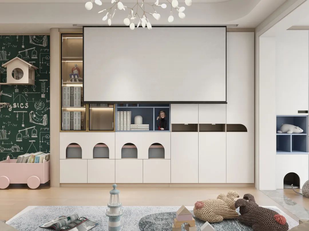 待小孩睡著(zhù)后,客廳空間就可以轉變成了夫妻兩人的私人影院,擼著(zhù)萌寵觀(guān)看電影,享受來(lái)之不易的浪漫時(shí)光。
