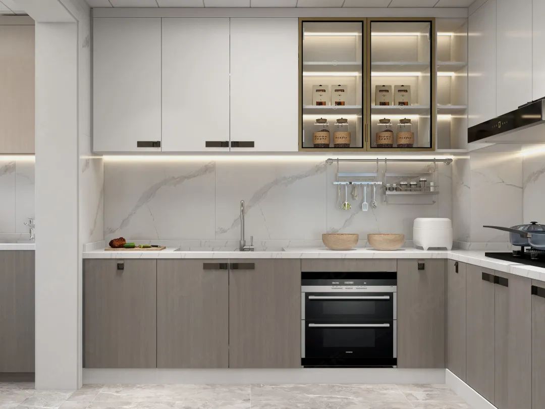 因戶(hù)型限制,且考慮到收納需求,廚房采用L型布局上方吊柜安裝玻璃掩門(mén),擺放調料瓶罐清晰可見(jiàn),方便隨放隨取。
