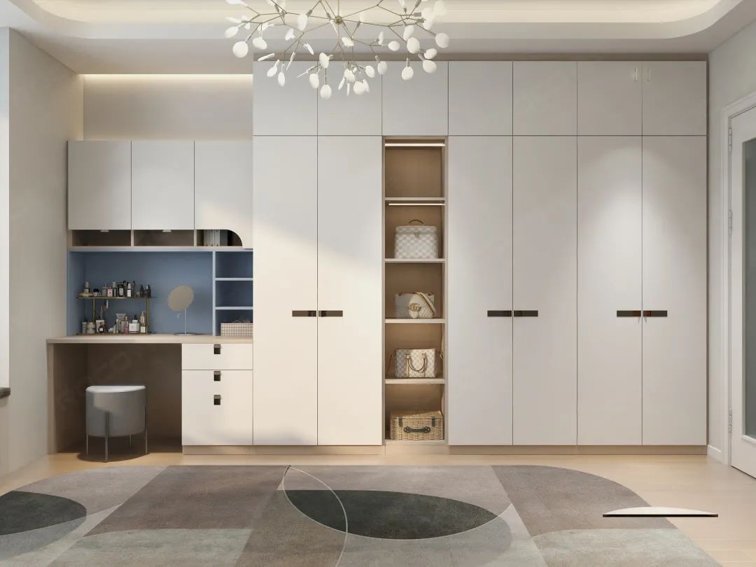 在床尾打造梳妝柜與衣柜一體設計,既滿(mǎn)足生活起居使用又便捷拿取,讓空間顯得純粹而又不失溫情。
